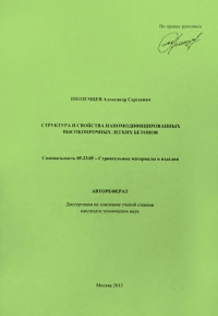 Автореферат диссертации на соискание ученой степени кандидата технических наук Иноземцева Александра Сергеевича "Структура и свойства наномодифицированных высокопрочных легких бетонов", научный руководитель - д.т.н., проф. Королев Евгений Валерьевич.